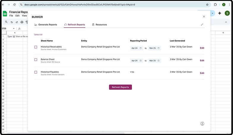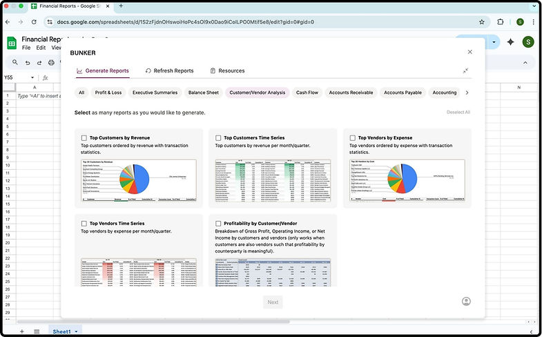 A Google Sheets extension that generates ready-to-use reports with data pre-filled directly from the client’s accounting software. Reports can be customized, shared, refreshed and exported with ease - reducing the manual burden of reporting while giving finance teams the flexibility to run custom analysis in a familiar environment.