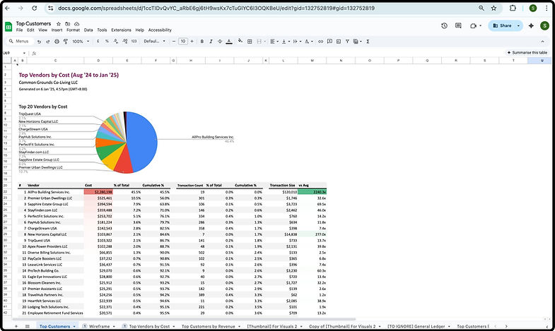 The final report was generated directly in Google Sheets, giving users a familiar environment to analyze, pivot, and share their data. The output was presented in a clean, professional format with charts, graphs, collapsible sections, and drill-down interactions where relevant.